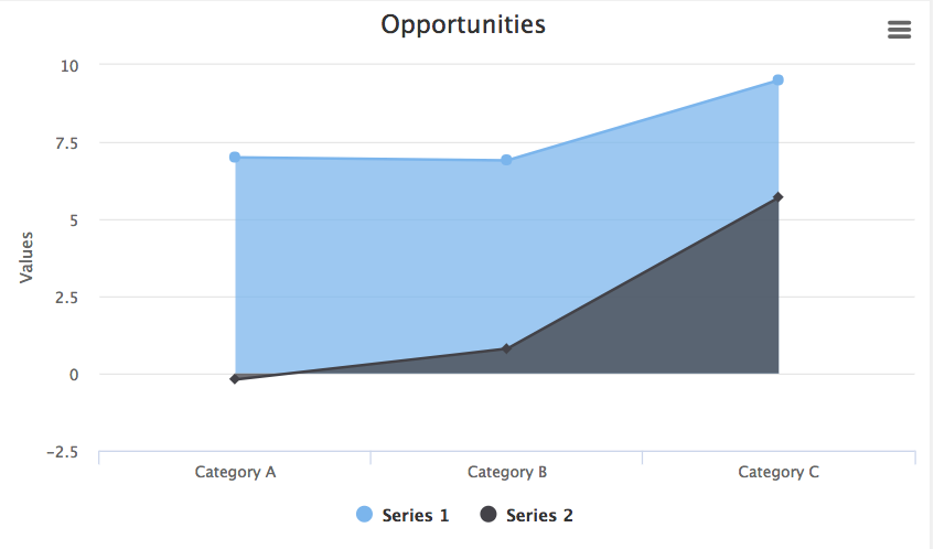 • Stack Series: If you set a Split Field for the chart data, the chart displays each division in the data (the “split”) in its own line, area, bar, or column side-by-side. Or, they can be be stacked.