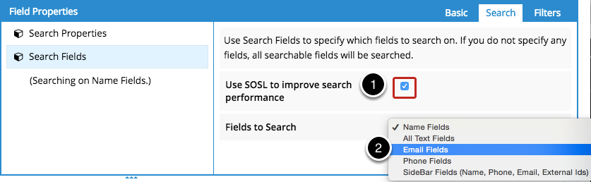 SOSL is a great option if you want to search long text fields like “Description”, because SOQL doesn’t do that. For more details about SOQL vs SOSL, see the Skuid on Salesforce expandable text under the Filters and Search tab in the Table topic.