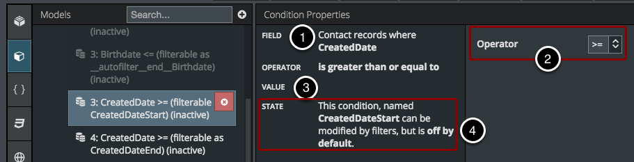 In this step we will add Start and End Date conditions using the CreatedDate field. Go into your table model, and click on Conditions to add a condition.