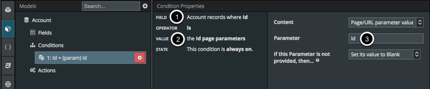 Because we want this page to be used as an override for the standard Account Detail (View) page, we need to tell our page to only show data from the Account that a user requests to see. By convention, this data will be handed to us in a URL Parameter called “id”, for instance, our browser URL might end with something like “/apex/UI?page=Account&id=0010000000fr243.” In this case, we’re being handed a parameter called id whose value is 0010000000fr243. So we need to create a Condition that takes value and does something with it.