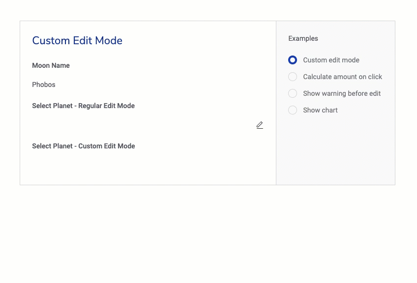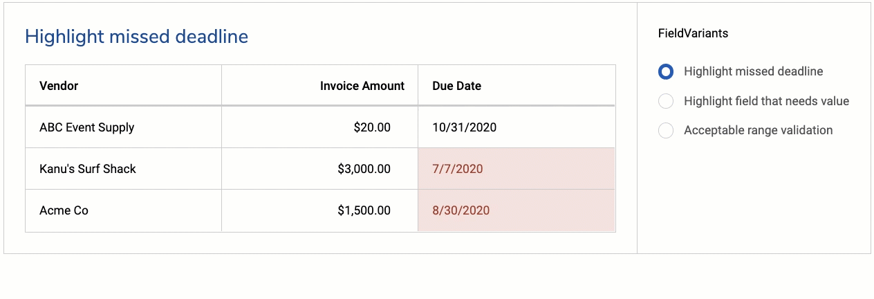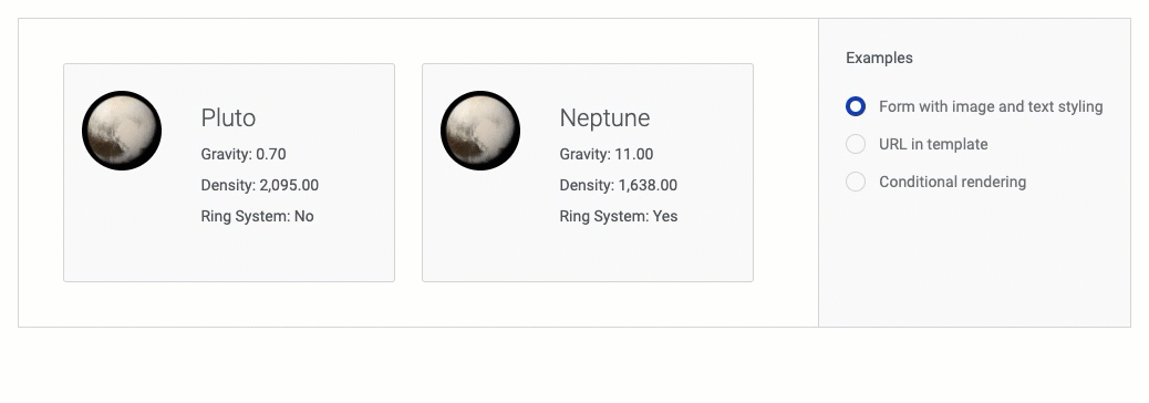 Custom field renderers: Let’s just cut to the chase: Custom field renderers are now available in v2. This was a popular tool in v1 and you clamored for it in v2. Now, builders can use the power of JavaScript to deliver custom data entry and display options to fields in both Form and Table components. Target specific user scenarios; leverage custom code snippets from Skuid Labs or the community; just make that field do exactly what you want it to do.