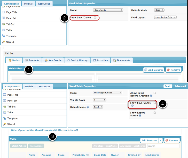 - If possible, use a Button Set component or Page Title component to create a universal Save button at the top of the page instead of having individual save buttons on each field editor and table component on the page.