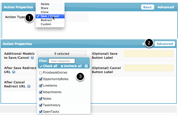 - In Basic Action Properties, choose Save / Cancel as the action type.