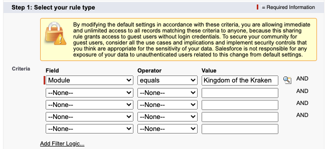 Optionally, change the filter logic to allow for one sharing rule to allow access to multiple pages. To do so, click Add Filter Logic and change the relationship between the filters to OR, e.g. 1 OR 2 OR 3