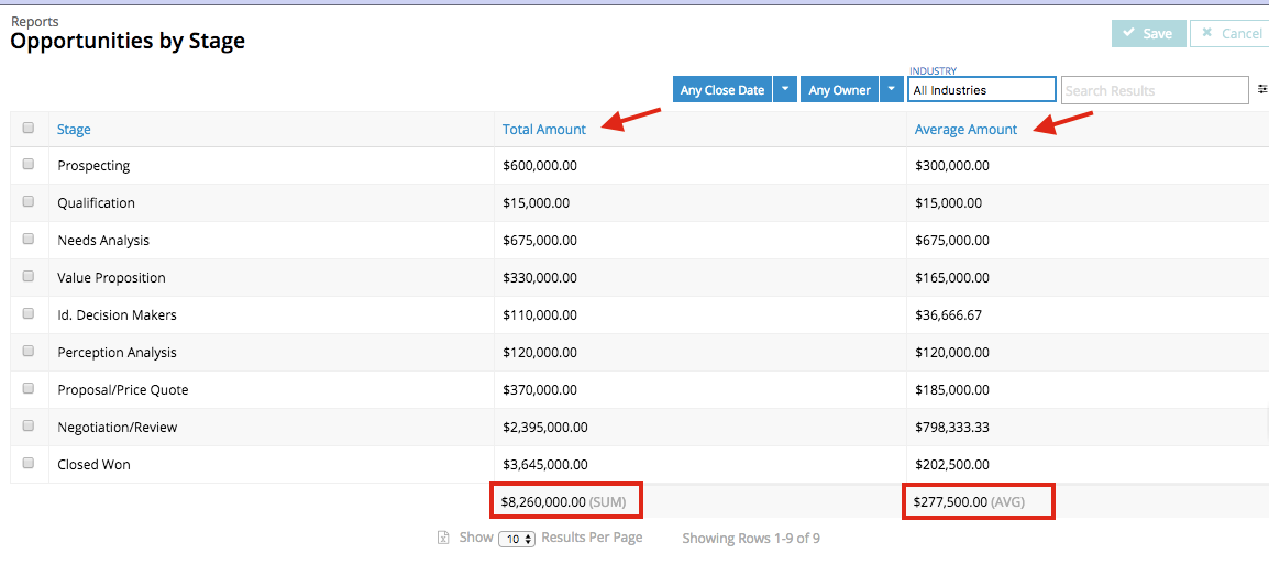 The table displays the opportunity stages, with a Total Amount and an Average Amount for each stage.
