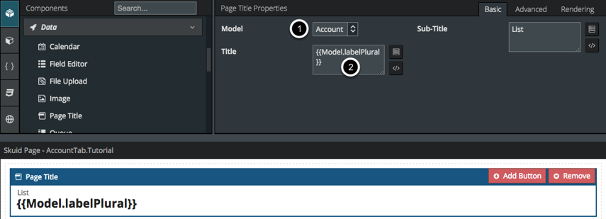 - A default title and subtitle template will be displayed. You can delete them and add in your own. The template{{Model.labelPlural}} will display the plural name of our object, in this case Accounts.