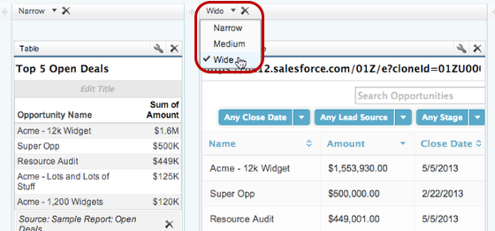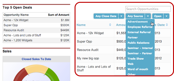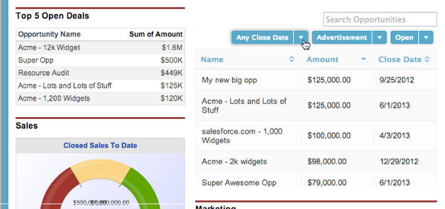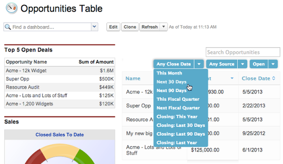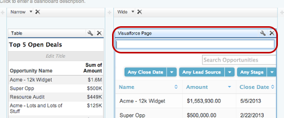 Instead of just having a static “Top 5 Open Deals” report on your dashboard, use Skuid to create a dynamic dashboard component that allows you to filter and search opportunities right on the dashboard.