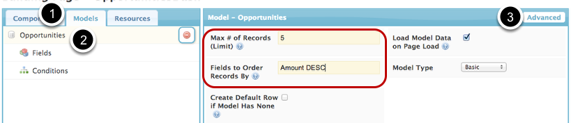 - Click Advanced and optimize your Model for dashboard: we’ll choose a low max # of records (5), and we’ll choose to order records by Amount DESC (amount descending i.e. highest to lowest).
