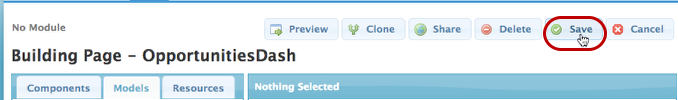 For this example, we’re going to use an Opportunity Tab page. This page from this tutorial includes lots of buttons and actions that are useful for a tab page but would clutter up a dashboard component. So we’ll clone this page to create a more Dashboard-friendly version.