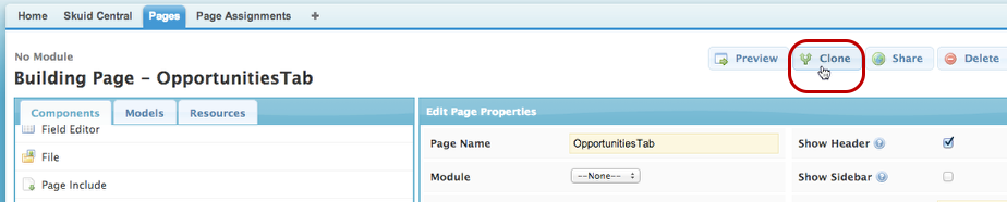 Step 1: In the Pages tab, go to the Skuid page you want to display in your dashboard and click Clone.¶