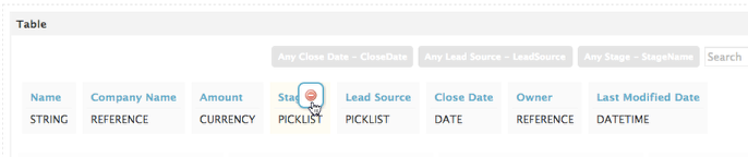 Click on a field and click to remove it. In this example, we’re removing all fields except Opportunity Name, Amount, and Close Date. We don’t have to include Stage and Lead Source in the table because we have filters on those fields.