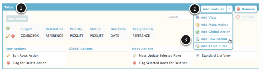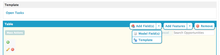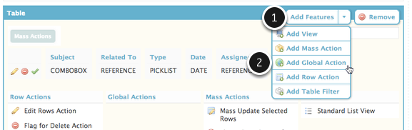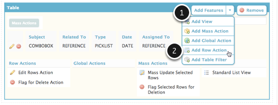 - Click on your Open Tasks table and click Add Features, then Add Row Action.