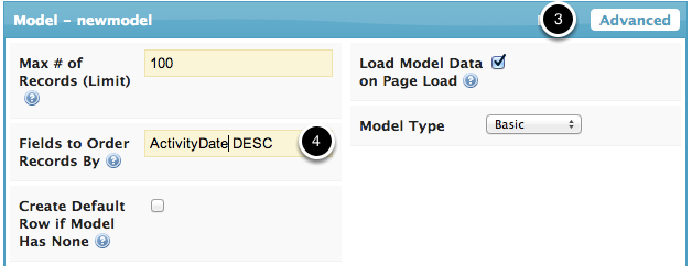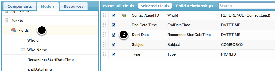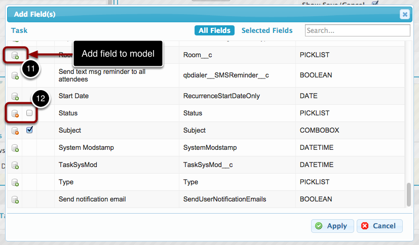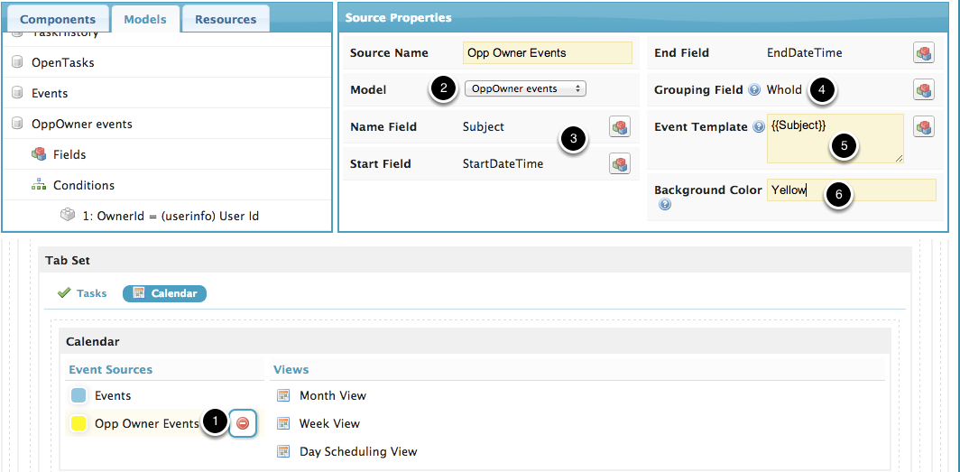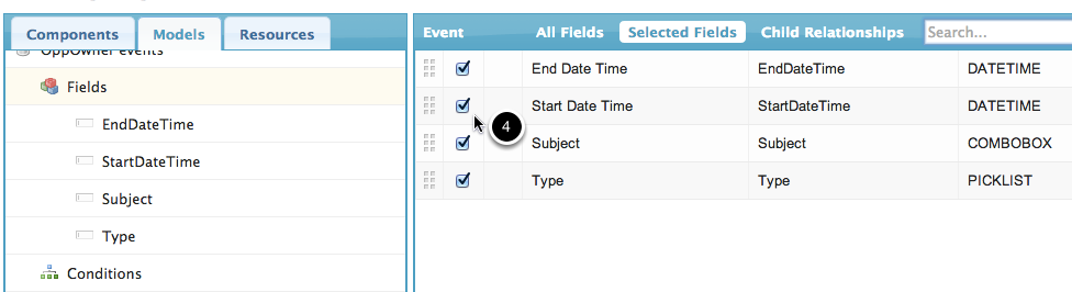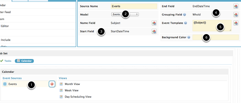- Select the appropriate fields, e.g. Subject for Name, Start Date Time for Start Field, End Date Time for End Field. (NB: For Start and End, you can use any Date Time field from any model).