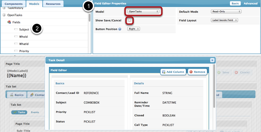 - Drag and drop the Field Editor into the popup page. Make sure you select the correct Model (Open Tasks in this case). You may want to also set the field editor as Read Only and uncheck Show Save/Cancel.