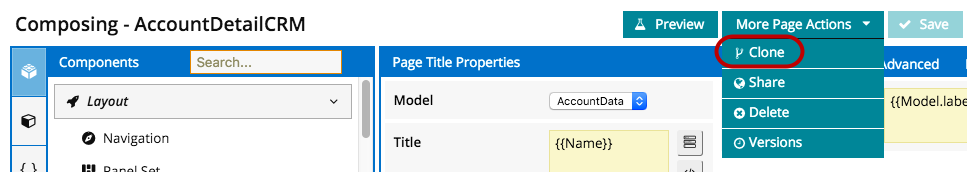 On this page we created an additional model called: “OriginalAccount” with just the Id and Name fields and an Id=param(Id) condition. While the title will reflect changes to the clone, if you create a similar model, this subtitle will pull in the name of the original account: