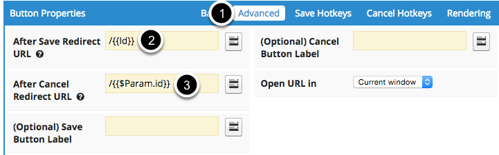 3. For Redirect after Cancel, enter /{{$Param.id}}