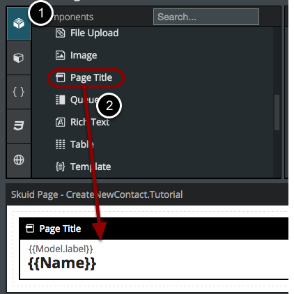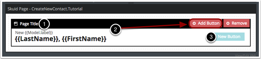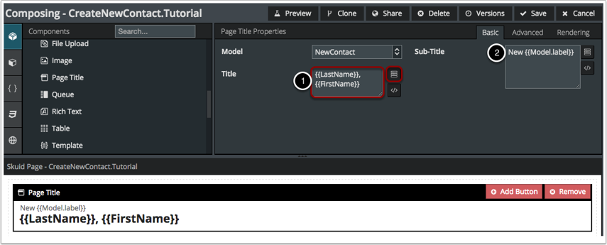 If you were to Save this page and click on the Preview button, then you would be directed to a nearly empty Skuid page with just the Page Title bar information. You’ll notice the Sub-Title says ‘New Contact’ (or whatever you typed in to the Sub-Title field). You’ll also notice that there is just a comma below the Sub-Title. The reason is that the {{LastName}} and {{FirstName}} fields are currently holding no data in the model! In the following sections, we’ll add text fields for you to enter the Last Name and First Name information. When a user is entering data in the Last Name and First Name fields, the curly brackets in your page title will automatically update with the information! Pretty cool.