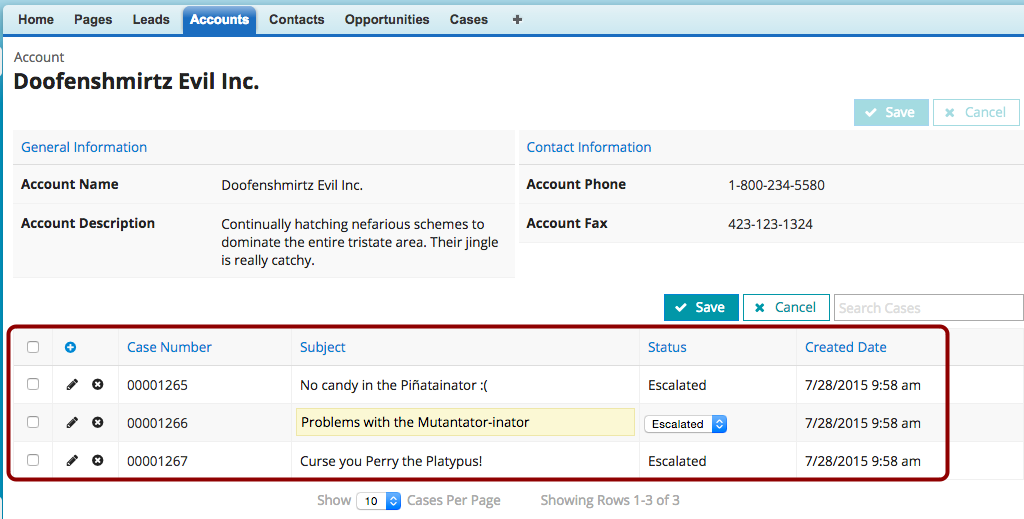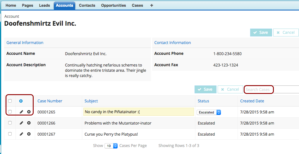 - Notice that you can easily search in this list and add, edit or delete records inline. Click on a Case Number to go to that Case’s page.