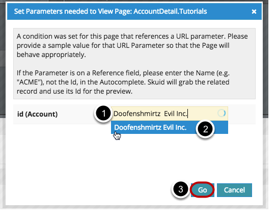 - Select the desired Account from the list. This Account’s Id field will be used to populate the Id URL Parameter when previewing our Account page.