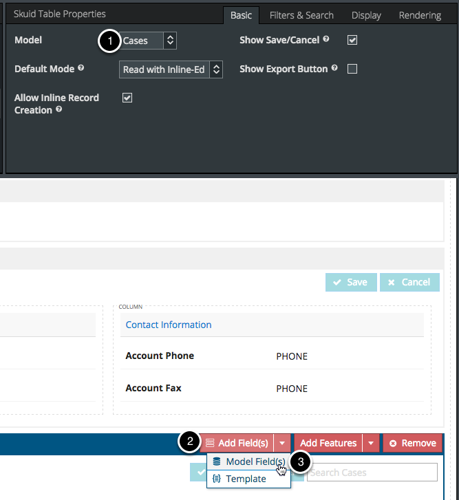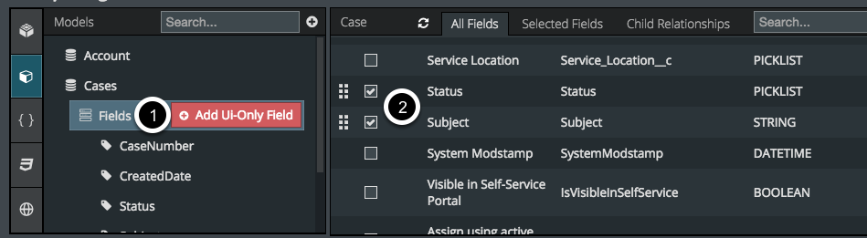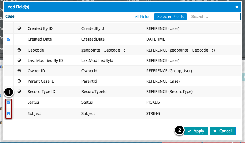 - Check the fields you’d like to include in the Model (to be used with your Table – for this example we’ll use Case Number, Created Date, Status, and Subject)