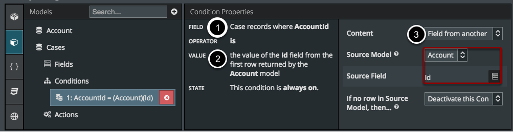 If you use the Field from another model condition, your child model MUST come beneath your parent model within your Models panel, as illustrated in the above image.