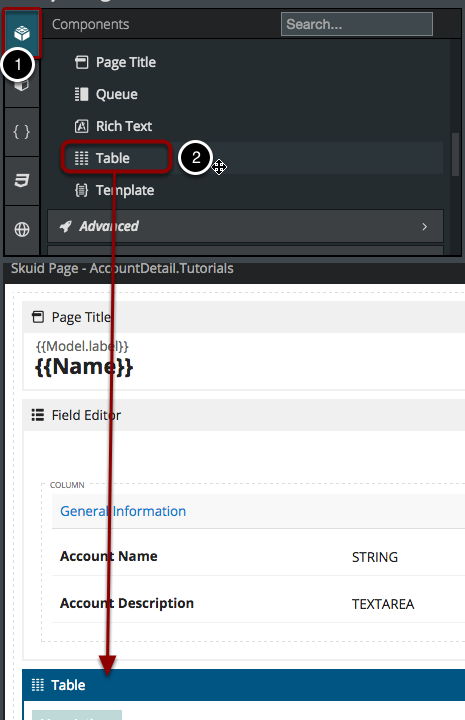 - Double click the Table Component (or drag and drop) to add it into the page below the Field Editor Component. (The orange strip lets you know where you can add components.)