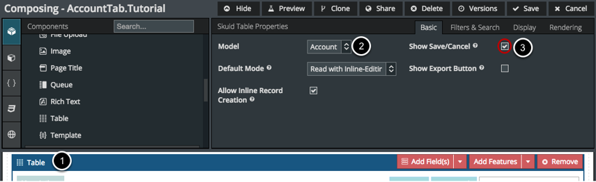We’ll be displaying the Account List using the Skuid table component. Skuid tables are inline editable and searchable by default. You can also create custom filters to search a list of records with ease.