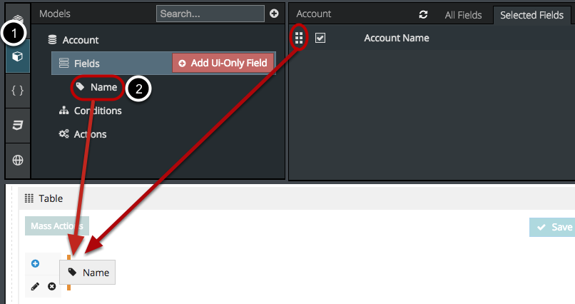 2. Click and drag the Name field into the table. (You can drag from the left or the right.) The orange strip lets you know where you can add fields into your table.